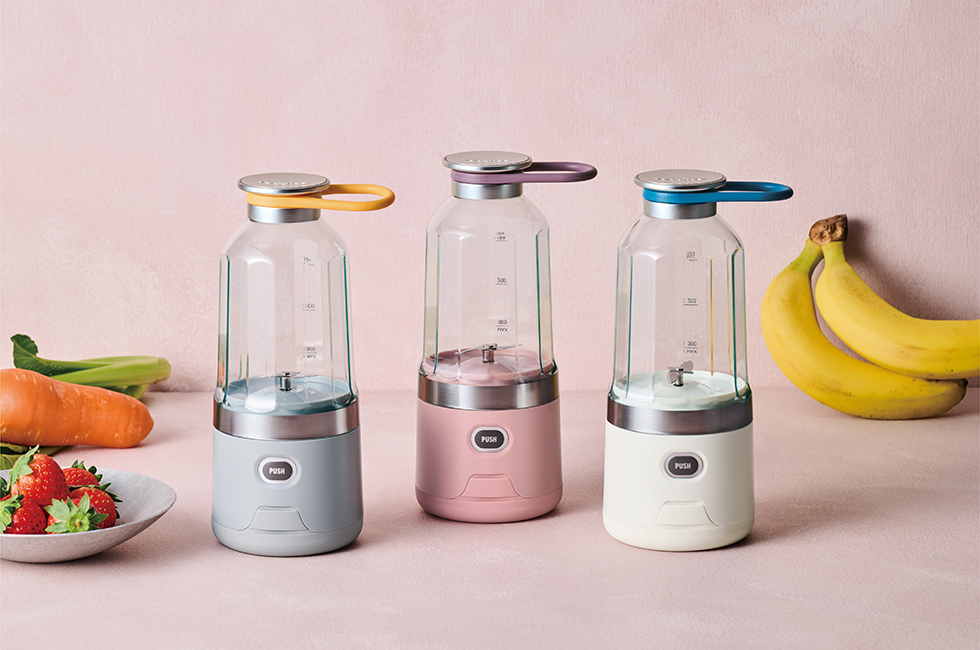 [ボトル]はガラスのようなクリアな質感と割れにくさを両立したトライタン製。[ボトル]から直接飲むのはもちろん、お気に入りのグラスに注いだり、[本体]から外して「グラス」として使ったりと、飲み方も自由。スムージーからアルコールを使ったドリンクまで、「ヘルシー」&「ご褒美」な30品を掲載した[専用レシピブック]が付属。容量は100〜300mlの飲み切りサイズ。[本体]のカラーは、ナチュラルホワイト、ライトグレー、ピンクの3色展開。持ち運びに便利な[ホルダー]付き。