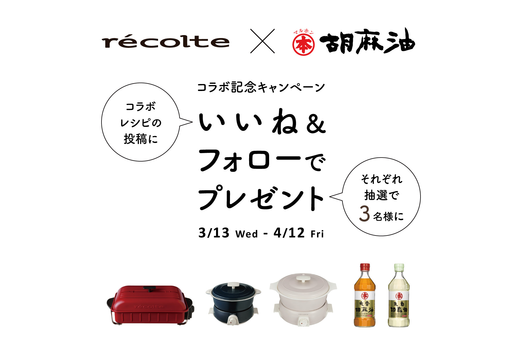 コラボレシピに使用したレコルト製品とマルホン胡麻油をセットでプレゼント!