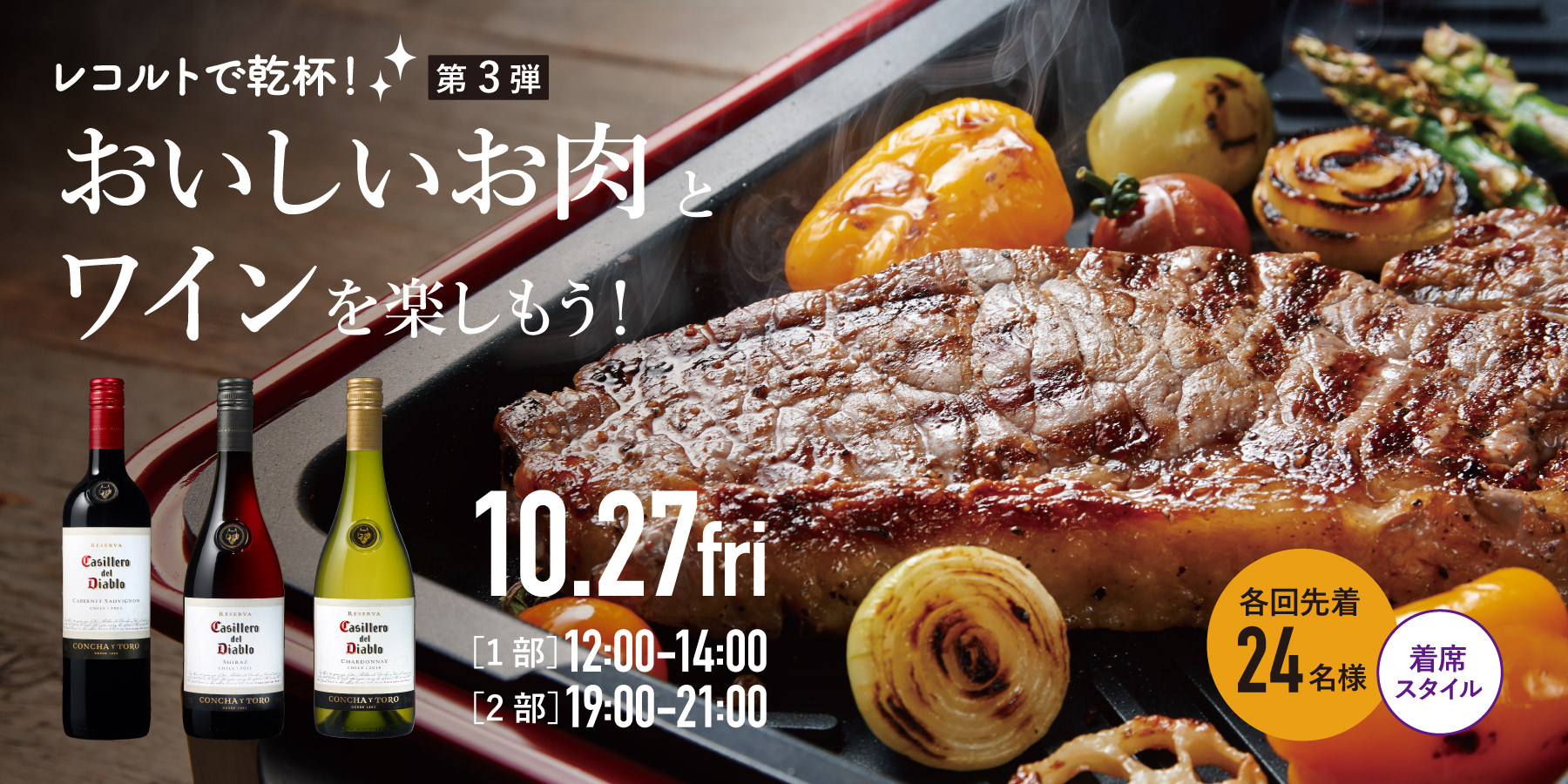 2017年10月27日(金)に、レコルトのテーブルクッキングプレート[ホームバーベキュー]で作るおいしいお肉料理と、メルシャン株式会社が提供するチリNo.1ワイナリー※コンチャ・イ・トロ社のワインブランド「カッシェロ・デル・ディアブロ」から3種のワインが味わえる、1日限りのイベントを開催します!第3弾は着席スタイルです!10月のプレミアムフライデーは、レコルト×メルシャンでおいしい乾杯をしませんか?(※INTELVID-Chile 2016)