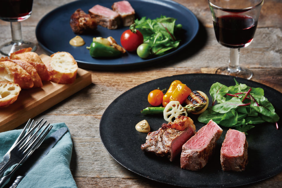 お肉料理はオージー・ビーフ、お肉料理やサラダのドレッシングなどに“感動オリーブオイル”(株式会社アミューズ)を使用します。※お肉料理は一部国産牛を使用します。
