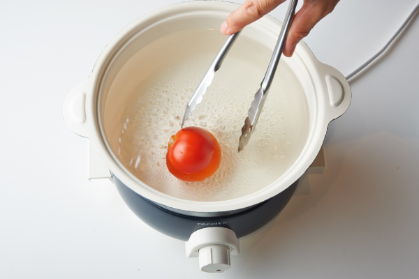 - ミディトマトを湯むきする。[ポットデュオ フェット]に[セラミックボウル]をセットして水500ml(分量外)を入れ、ツマミを[3]にして沸かす。沸騰したらミディトマトを入れて2〜3秒ほど転がしてサッと茹でる。