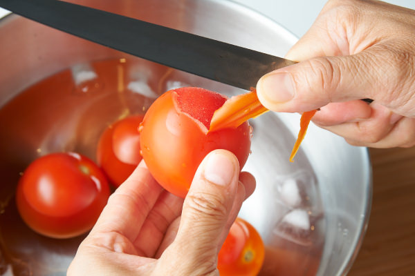 - すぐに氷水に移して皮をむく。