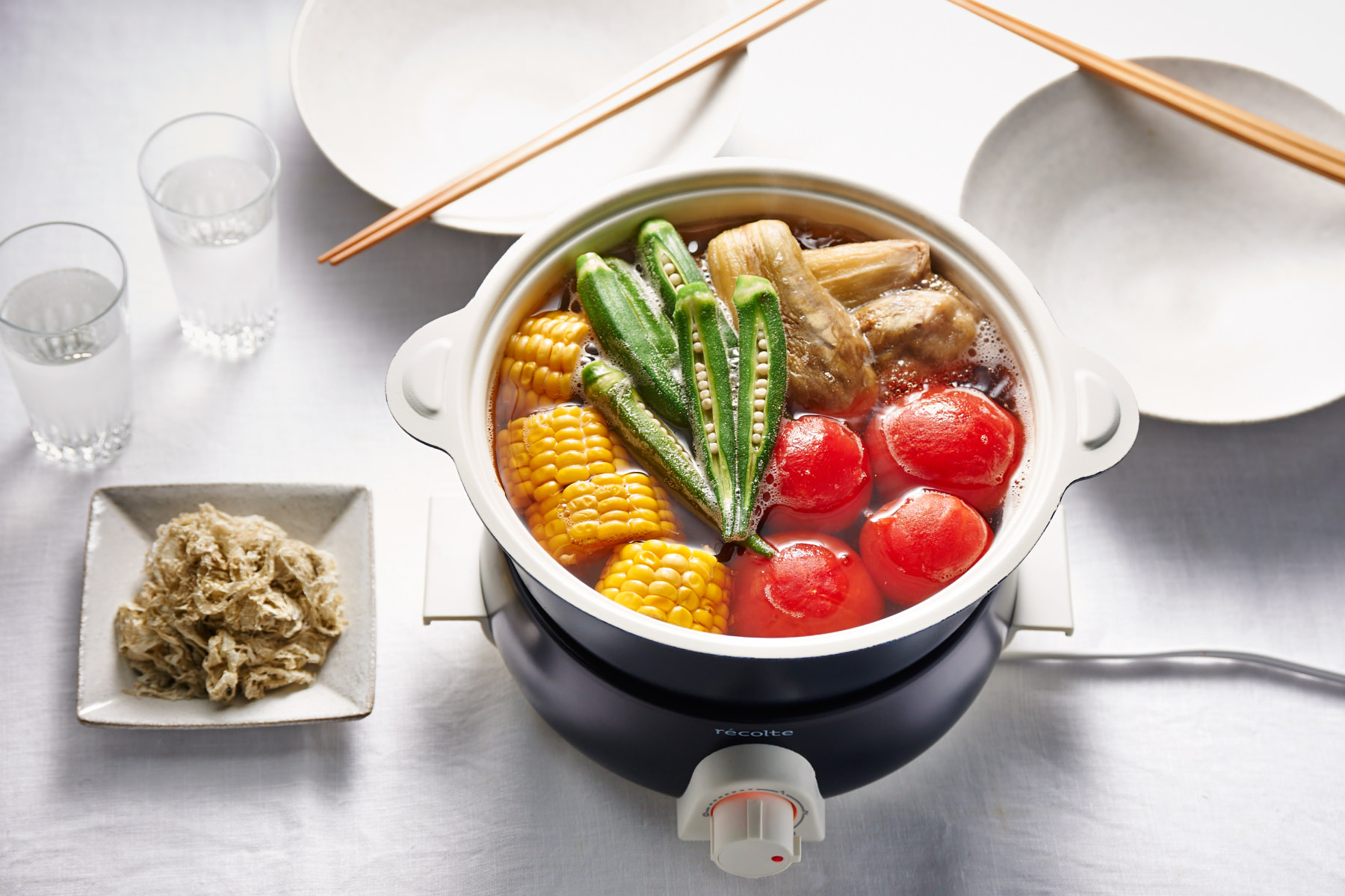 - [ポットデュオ フェット]に再びセラミックボウルをセットして【A】と下準備したミディトマト、おくら、なす、とうもろこしを入れる。ツマミを[3]にして加熱し、沸騰したらツマミを[1]にして3分煮る。