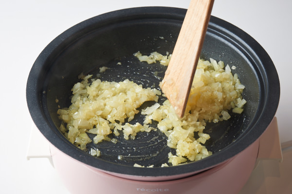 - [ポットデュオ フェット]に[グリルプレート]をセットして玉ねぎ、にんにく、オリーブオイルを入れ、ツマミ[2]で玉ねぎが透明になるまで炒める。