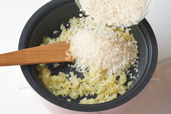 - 米を入れて全体を混ぜ合わせながら炒める。