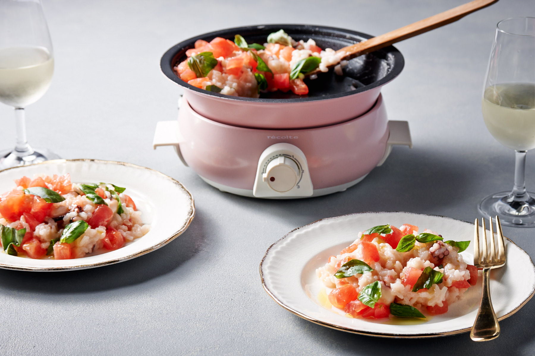 たこの旨みと食感を楽しむ、ふんわり可愛らしいピンク色のリゾット。フレッシュなトマトとバジルを合わせることでさわやかな風味に仕上がります。このリゾットはお米の煮え具合を確認しながら、水を少しずつ加えて加熱するのがポイント。ちょっと面倒な作業だけど[ポットデュオ フェット]なら香りを楽しみながらテーブルで仕上げられます。白ワインと一緒に楽しみたいメニュー♪