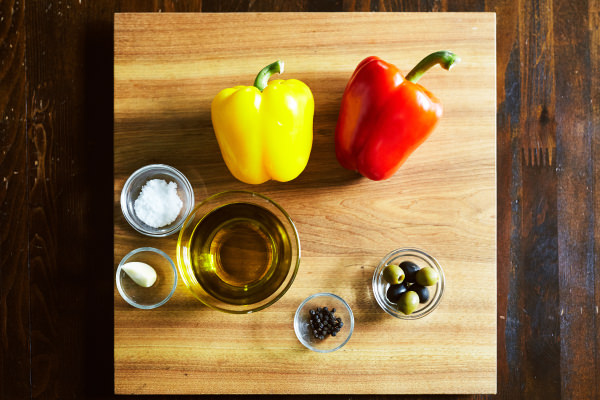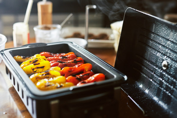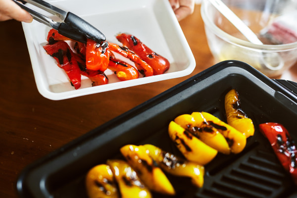焼いて皮をむいたパプリカを、にんにくやスパイスと一緒にオリーブオイルに漬け込むレシピです。いつもはオーブンやグリルで皮が真っ黒になるまで丸焼きにするのですが、[ホームバーベキュー]で作ったらもっと簡単においしくできました。その理由は穴あきの[バーベキュープレート]。フタをすればプレート全体が程よい蒸し焼き状態になり、さらにパプリカの余分な水分が抜けて、果肉が甘〜くとろとろになります。皮をむくので口当たりがよく、そのままでペロリとおいしいおつまみになりますし、サンドイッチやパスタの具材として、また、お肉料理などの付け合わせにもおすすめです。