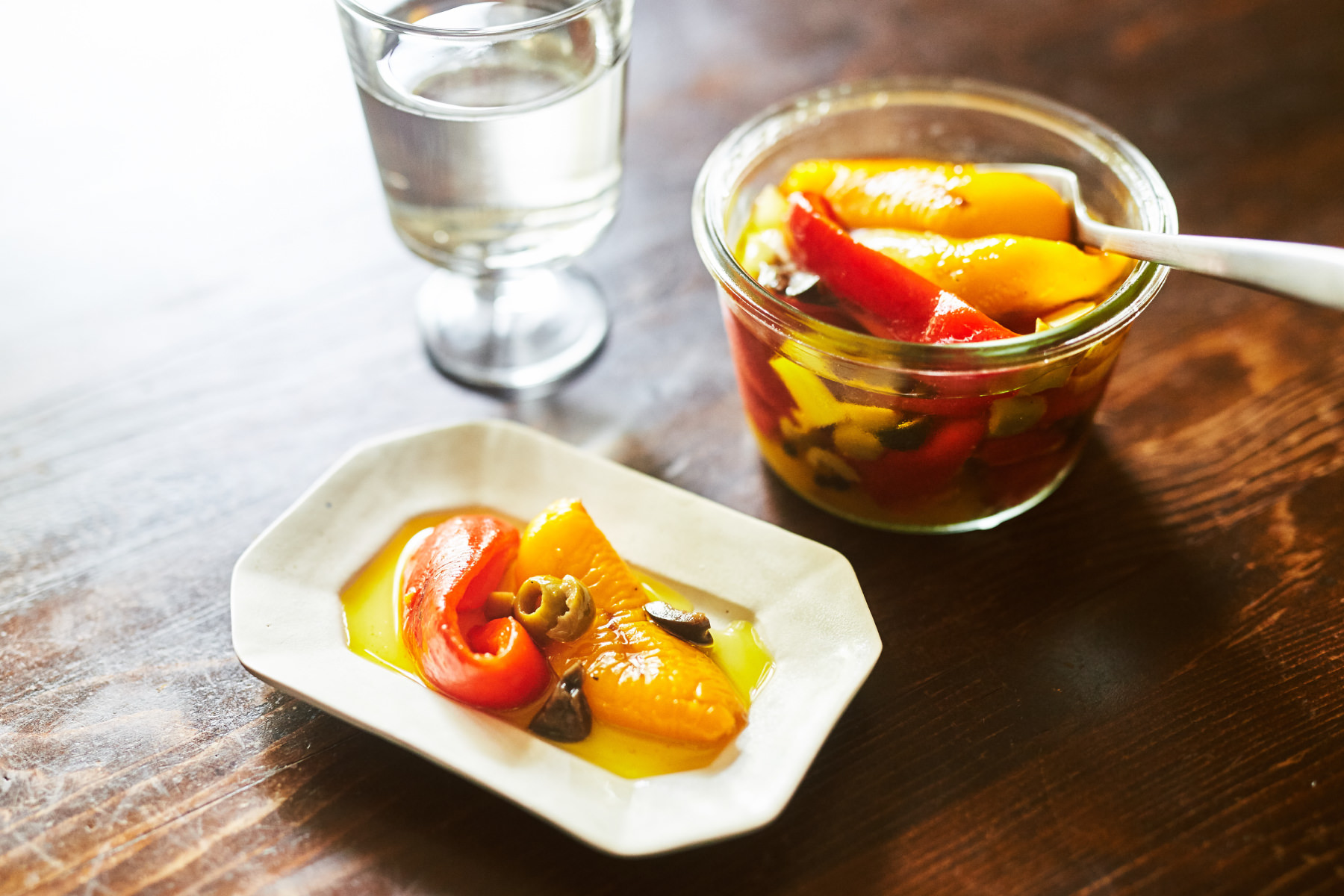 - パプリカがかぶるくらいまでオリーブオイルを注ぎ入れる。