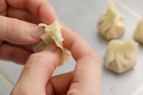 - 皮の中央に③の具をのせ、皮の周囲に水をつけ、上にひだを寄せるようにして皮を集める。
