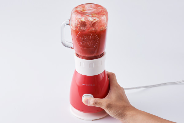 - 【ラズベリードレッシング】を作る。[ソロブレンダーソラン]の[ガラスジャー]に【A】の材料をすべて入れ、本体にセットする。