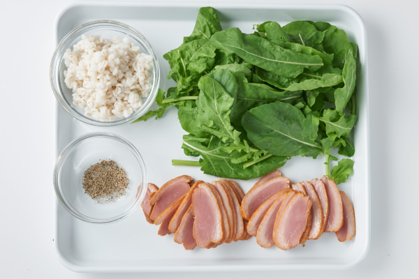 - 【サラダ】の材料を用意する。押し麦は15分ほど茹でてザルにあげ、水気を切って冷ましておく。鴨スモークは薄くそぎ切りにする。ルッコラは食べやすい大きさに手でちぎる。