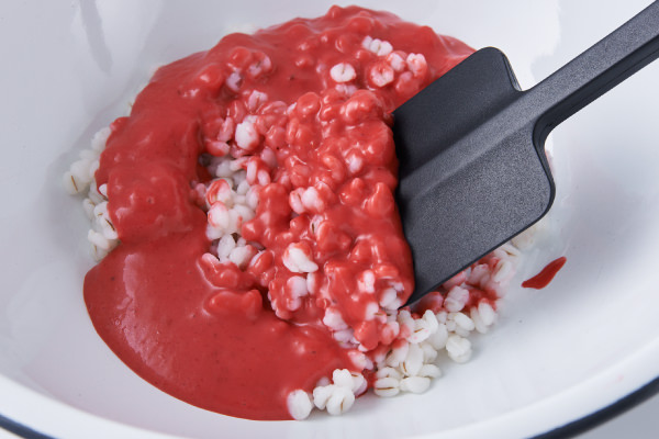 - 押し麦とドレッシングを先に混ぜ合わせると、押し麦がきれいなピンク色に染まります。