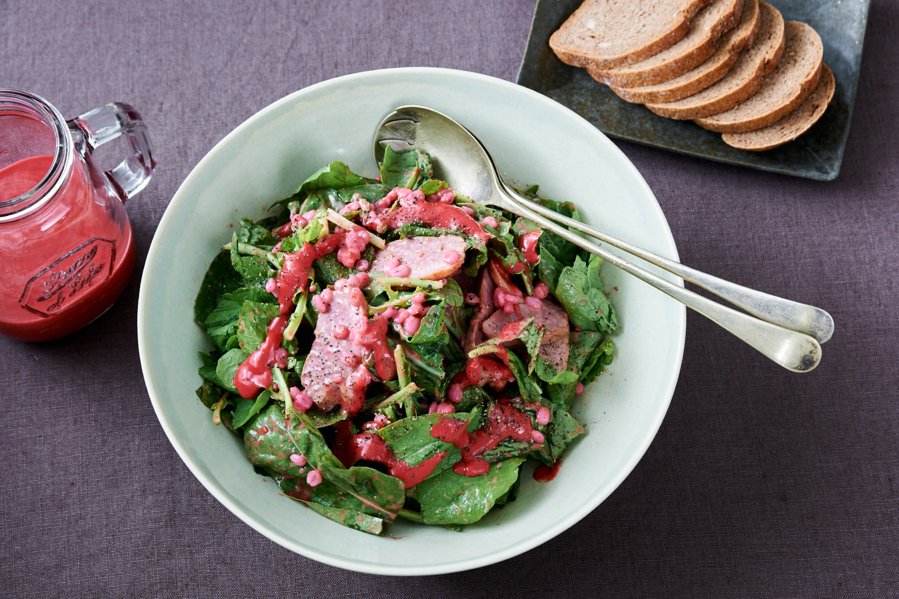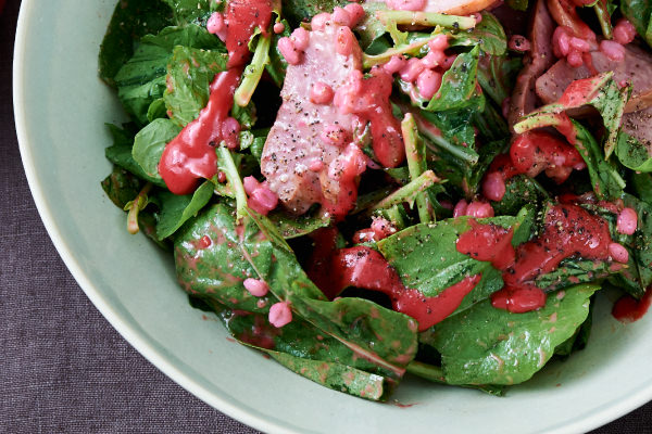 鴨のスモークと少し苦味のあるルッコラ、プチプチ食感が楽しい押し麦のサラダにラズベリーの酸味と香りを生かした色鮮やかなピンク色のラズベリードレッシングを合わせます。ラズベリードレッシングでピンク色に染めた押し麦は、見た目にも楽しいアクセントに。このサラダには酸味のあるライ麦パンがおすすめです。