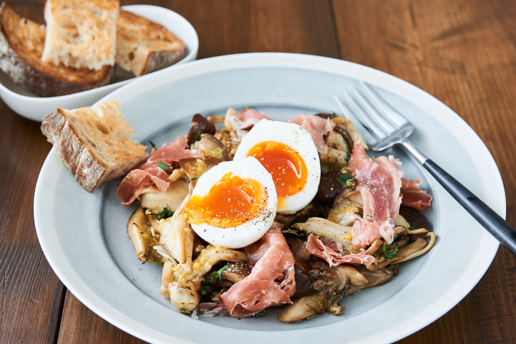 今では1年を通して手に入るきのこですが、多くの天然のきのこは秋に旬を迎えるものが多いと言われます。旬のきのこを味わうサラダは、ぜひ手作りのマスタードでドレッシングを作って召し上がってください。作ってみると意外と簡単な手作りマスタードはピリッと辛みの効いた風味豊かな味わいです。きのこと相性がぴったりの生ハムと合わせれば最高のごちそう。酸味のあるカンパーニュを添えていただくのがおすすめです。
