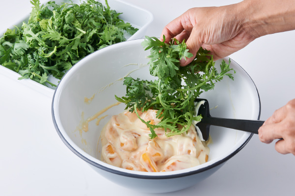 - ボウルに柿と白和えドレッシングを入れ、混ぜ合わせる。春菊を入れ、さっくりと混ぜ合わせる。