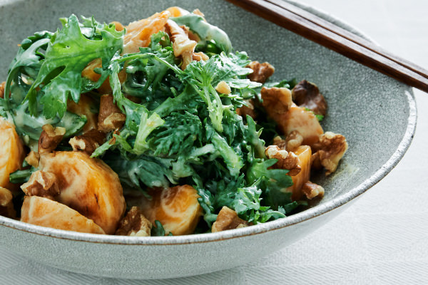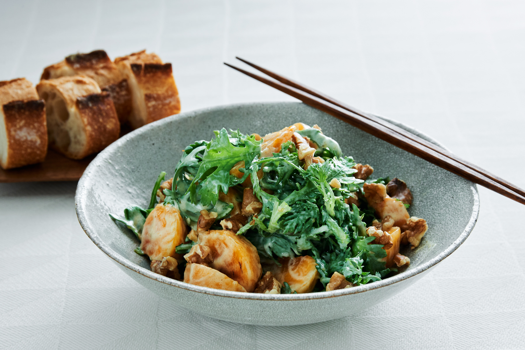 秋を感じる果物といえば柿。柿には美容やアルコール分解に良い成分が含まれているので、夏の陽射しで疲れた肌や、お酒の量が増えてくるこれからの季節にはぜひ食べたい果物。柿はそのまま食べたり、スイーツにする他、実はサラダに使うのもおすすめです。今回は春菊やくるみと、白和えドレッシングであえて食べるサラダにしました。白和えドレッシングは豆腐ごとブレンダーで撹拌することで、なめらかでクリーミーな口当たり。バゲットを添えていただくのがおすすめです。