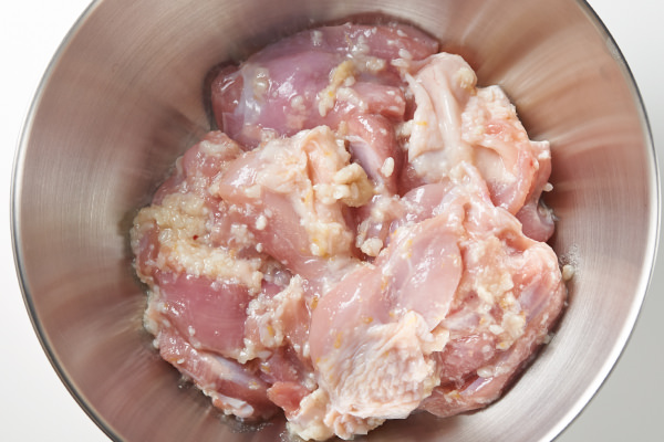 - ボウルに鶏肉と【A】の材料を全て入れて、手でもむように混ぜ合わせる。