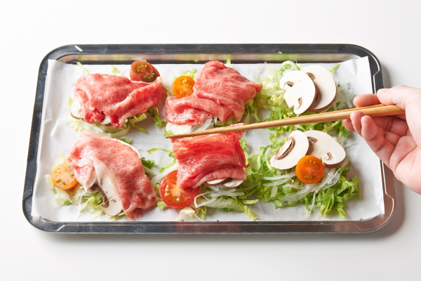 - 用意した野菜を6等分にのせ、その上に牛肉を広げて重ねる。