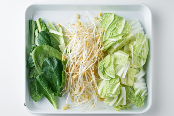- 沸いてきたら白菜の芯の部分を入れ、2~3分煮る。白菜の葉、小松菜、豆もやしを加え、火が通ったら、つけだれやゆずこしょうをつけていただく。