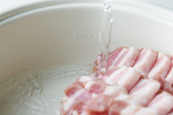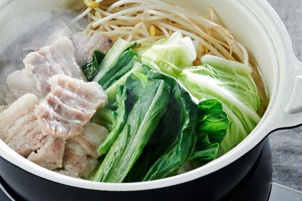 - ⑤の【塩豚】を3mm厚さに切る。[ポットデュオ フェット]に[セラミックボウル]をセットし、野菜を入れるスペースを残して塩豚を片側に入れる。水(分量外)をセラミックボウル内側の「MAX」のラインの少し下まで注ぎ、ツマミを[3]にして加熱する。