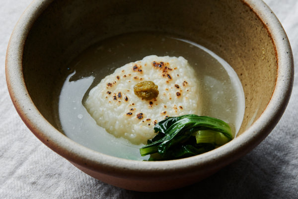 - お鍋を楽しんだらシメる。焼きおにぎりを器に盛り、鍋のスープをかける。お好みで、つけだれやゆずこしょうをつけていただく。