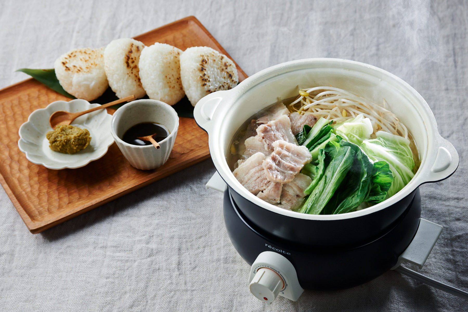 豚肉は、塩豚にすると余分な水分が抜け、より旨みが増します。この鍋は、[ポットデュオ フェット]に塩豚と水を入れるだけで旨みが出るので、だしをとらなくてもOK。味のアクセントは、ゆずこしょうに加えて「黒こしょう+ごま油」もオススメ。粋な味わいになります。シメは「焼きおにぎり茶漬け」。香ばしい焼きおにぎりにさらりとしたスープをかければ料亭の味! 最後までおいしいオトナ鍋です。