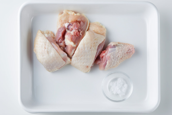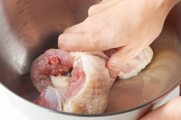- 骨付き鶏もも肉はさっと水洗いして塩をまぶし、塩がなじむまでよくもみ混む(この時、骨の切り口で手を切らないよう注意!)
