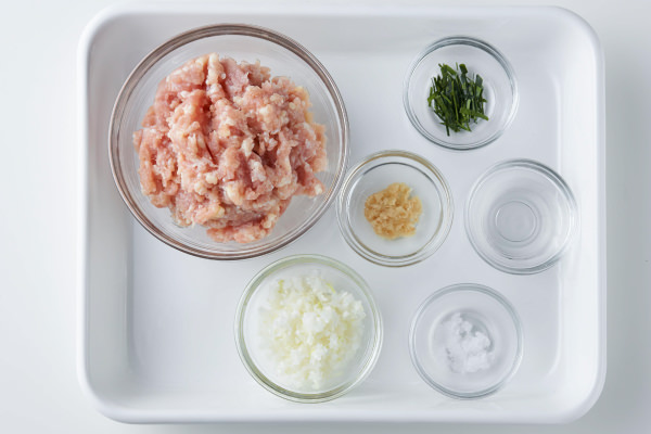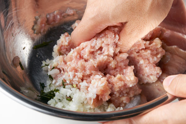 - 鶏だんごを作る。材料を全てボウルに入れ、手でよく混ぜ合わせる。