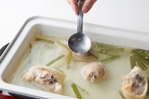 - [ホームバーベキュー]に[セラミックスチーム深鍋]をセットし、②とレモングラス、水を入れ、ツマミを[3]にして加熱する。アクが出てきたらすくう。