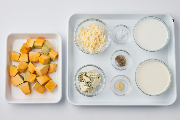 - 【かぼちゃとブルーチーズのグラタン】を作る。材料を準備する。