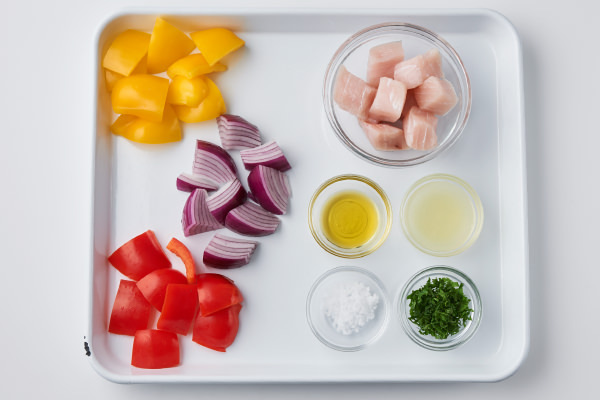 - 【カジキとカラフル野菜の串焼き】を作る。材料を準備する。