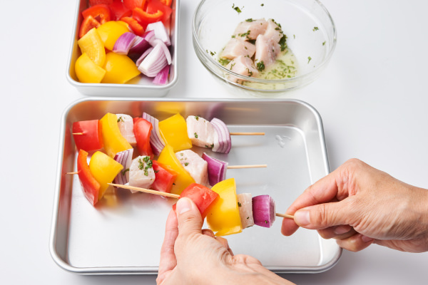 - 竹串に⑰のカジキと野菜を2切れずつ刺す。