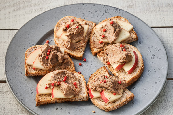 - ②にりんごをのせてレバーペーストを塗り、黒こしょうとピンクペッパ ーを散らす。