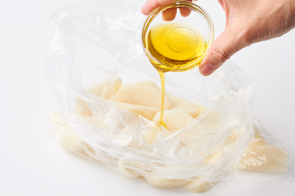 - じゃがいも、塩、オリーブオイルをポリ袋に入れ、全体をもんでよく混ぜ合わせる。
