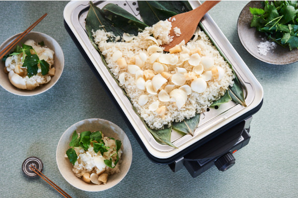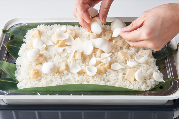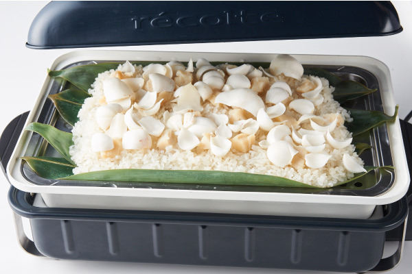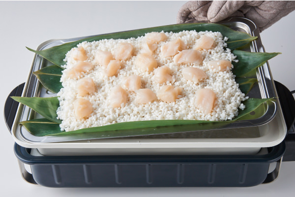 - もち米の上にほたて貝柱をのせ、[蒸しプレート]を④にセットする(本体が熱くなっているので注意)。