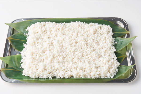 - [蒸しプレート]に笹の葉を敷き、もち米を均一に広げる(笹の葉を敷くことで、もち米が[蒸しプレート]の穴から落ちない)。