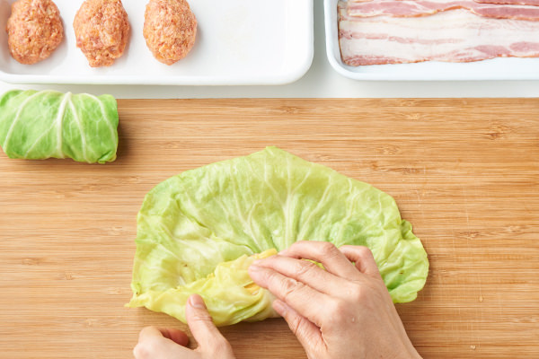 - たねをキャベツの葉で巻く。最初に手前の葉をタネにかぶせ、左右の葉を内側に折り込みながらしっかりと巻いて包む。残りも同様に包む。