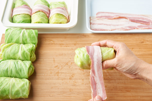 - それぞれにベーコンを1枚ずつ巻きつける。