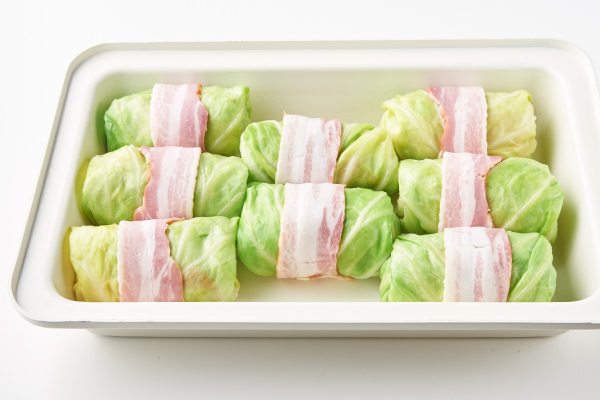 - 今回は、キャベツの大きい葉と小さい葉を重ねて巻きました。葉が大きい場合は1枚でも大丈夫です。小さい場合は、葉を2枚重ねて巻くとしっかり巻けるので、煮崩れしにくくなります。