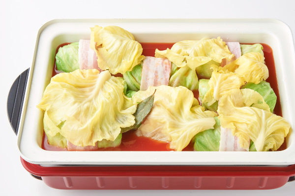 - 【B】を混ぜ合わせ、ローリエとともに入れる。この時、キャベツの小さい葉が余っていたら、上にのせる。