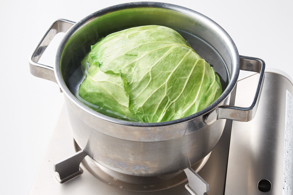 - キャベツが丸ごと入る大きめの鍋に湯を沸かす。キャベツは芯をくり抜いて、鍋に丸ごと入れ、時々、上下をひっくり返しながら1分ほどゆでる。
