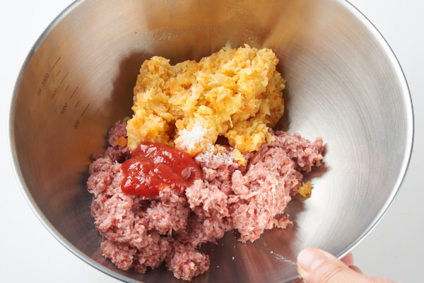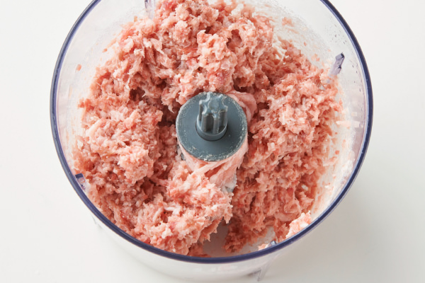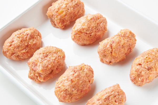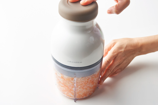 - 牛こま切れ肉と豚こま切れ肉を[カプセルカッター キャトル]に入れ、連続プッシュしてミンチ状にする。