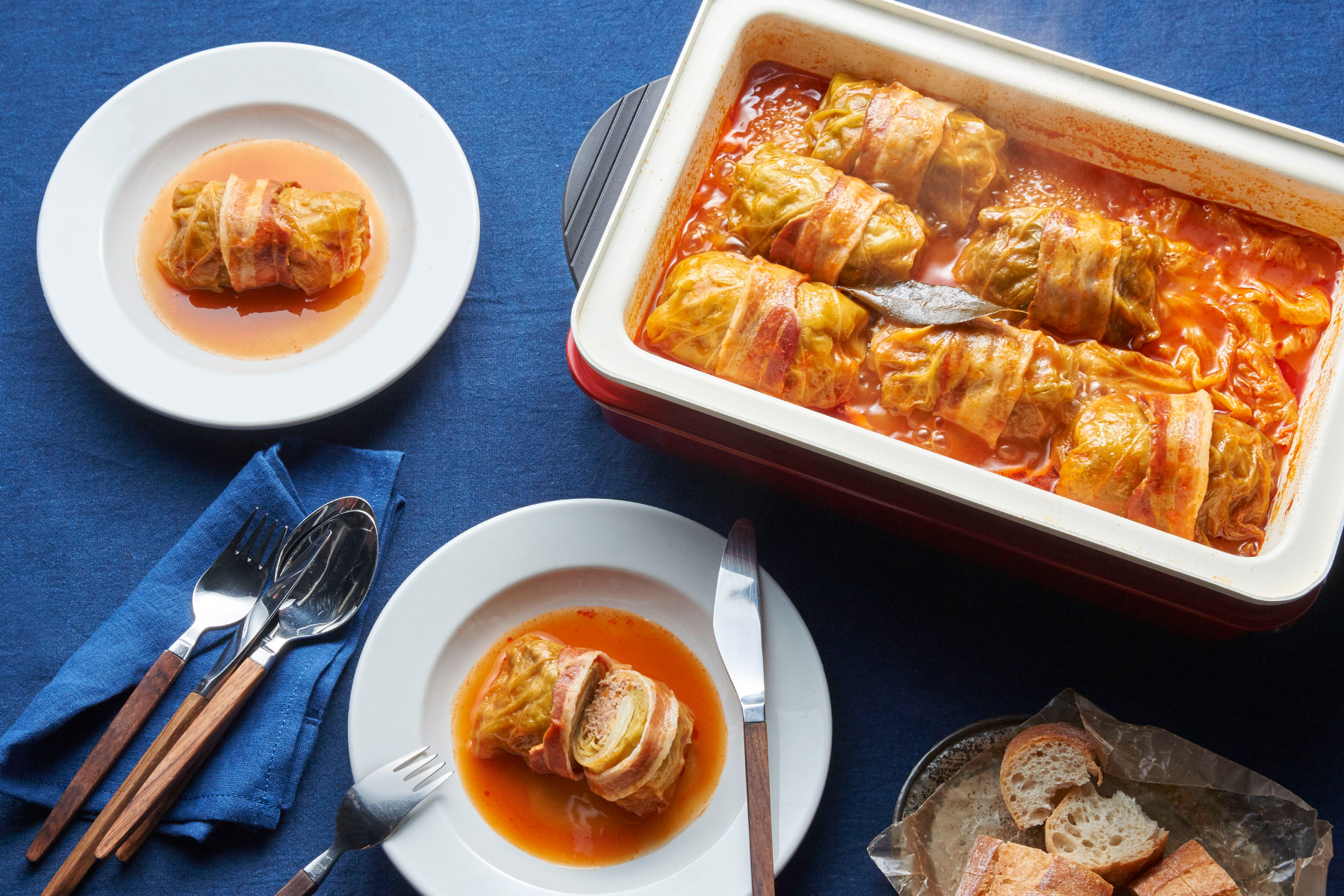 寒い日のごちそうといえば、ロールキャベツ! 今回は、通常は巻きにくくなるのでとってしまうキャベツの芯や葉の軸も[カプセルカッター キャトル]を使って、全部タネに使います。「芯や軸を使うと、ほんのり甘さも出るんですよ」と村山さん。煮込みには[ホームバーベキュー]の[セラミックスチーム深鍋]を。ロールキャベツを並べやすく、全体に火が通りやすくて便利です。とろっとろになるまで煮込んだボリュームたっぷりのロールキャベツで、今夜はほっこりあったまって。