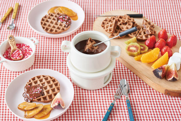 バレンタインパーティーのふたつめのメニューは、子どもにも大人にも大人気のチョコレートフォンデュ。スマイルベイカーミニのワッフルでココアワッフルを焼きます。好きな具材にチョコレートを絡めて召し上がれ♪ バナナのキャラメリゼも、チョコレートによく合います。
