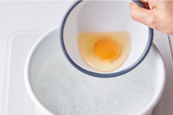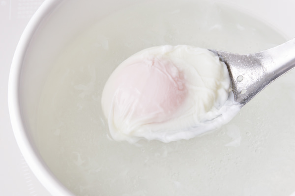 - 途中、広がった白身をスプーンで絡めながら黄身を包みこむようにし、好みの硬さになったら湯から取り出してキッチンペーパーなどでしっかり水気をきる。