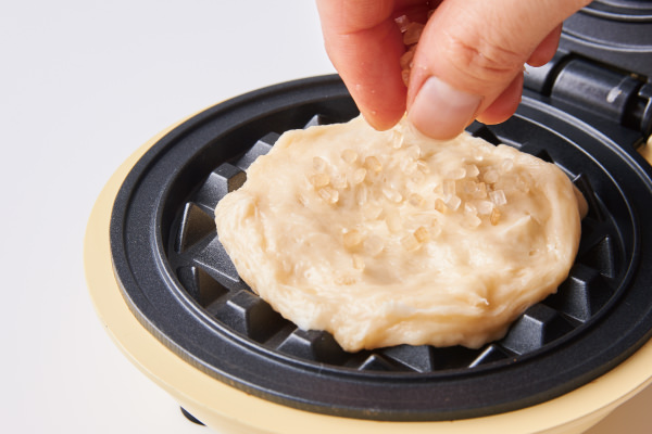 ランチパーティーにスマイルベイカーミニで作る、もうひとつのおすすめメニューは、デザートにもなるリエージュワッフル。強力粉のもっちりした生地と、ざらめのシャリッとした食感が絶妙なおいしさです。