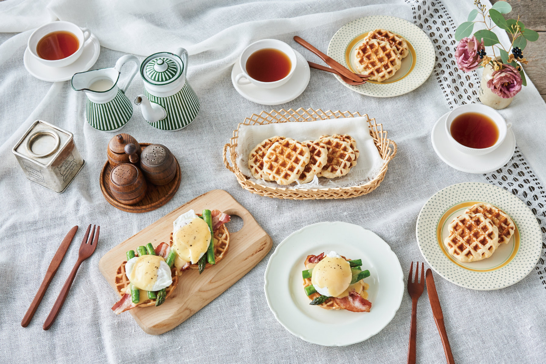 ランチに食べるものって、自分だけだとちゃちゃっとすませがち。そんなランチタイムですが、お客さまが来るとなるとちょっと気合いを入れたくなります。でも何を作ろう?って悩んでしまう…。そんなとき、大活躍してくれるのがスマイルベイカーミニ!みんなで一緒にワイワイ準備しながら、いつもより少し丁寧に支度をするだけで、ちょっと贅沢でハッピーな気分になるものです。ひとつめに紹介するのはランチにぴったりのエッグベネディクト。焼いたワッフルに、ベーコン、アスパラ、黄身がとろ〜り美味しいポーチドエッグをのせていただきます。思い立ったらすぐにできちゃうランチパーティー♪ 早速お友達を誘ってランチしませんか?