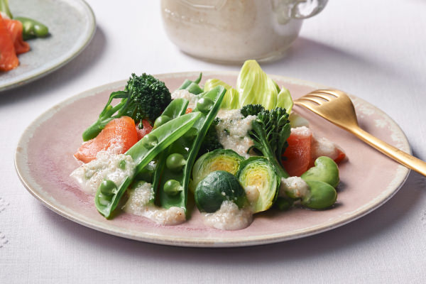 さやえんどう、菜の花、そら豆にサーモン…。鮮やかなビタミンカラーの食材がまとうのは、新玉ねぎで作る真っ白なドレッシング。辛みが少なく、甘くみずみずしい新玉ねぎを[ソロブレンダー ソラン]で撹拌するだけでプロの味に。今回は、ふんわり優しい白のドレッシングになるよう、白しょうゆを使いました。肉や魚料理にも合う万能ドレッシングです。