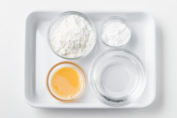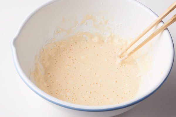 - 衣を作る。ボウルに溶き卵と冷水を入れ、菜箸で混ぜ合わせる。薄力粉と片栗粉を一緒にふるい入れ、さっくりと混ぜ合わせる(ダマが残っているくらいでOK)。