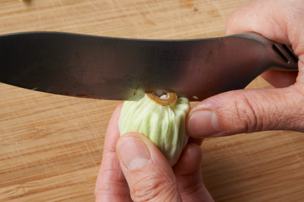 - たらの芽は、株元の硬いハカマの部分を包丁で削る。株元が大きいものは十字に切り込みを入れる。